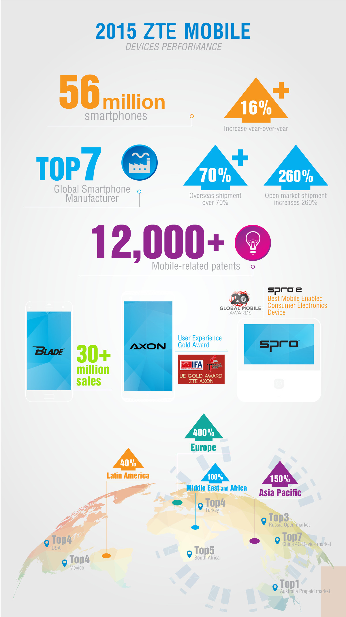 W 2015 r. ZTE dostarczyło ponad 56 milionów smartfonów, co stanowi wzrost o 16% w porównaniu do poprzednich 12 miesięcy. O ponad 70% wzrosły zamówienia z zagranicy, a ZTE dołączyło do grona liderów na kilku ważnych rynkach. Firma sprzedała 15 milionów smartfonów w Stanach Zjednoczonych. Wzrost o 30% sprawił, że firma znalazła się w czwórce największych dostawców urządzeń tego typu w USA. Ponadto, ZTE odnotowało znaczące wzrosty sprzedaży w Europie (400%), Bliskim Wschodzie (100%), Azji i Pacyfiku (150%) oraz Ameryce Łacińskiej (40%). Producent znajduje się na pierwszym miejscu w Australii wśród dostawców urządzeń na rynku prepaid, zajmuje trzecie miejsce w Rosji (z 10% udziałem w rynku), jak również jest w pierwszej piątce w takich krajach jak: Turcja, Meksyk i RPA.