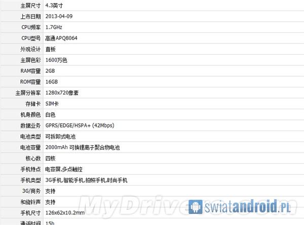 Na jego pokładzie ma się także znaleźć 8-megapikselowy aparat główny z diodą doświetlającą LED, kamera frontowa o matrycy 2 Mpix oraz akumulator o pojemności 2000 mAh. Ponadto smartfon otrzymać ma wsparcie dla szybkiej transmisji danych w standardzie HSPA+ i pracować ma pod kontrolą MIUI V5. Całość zamknięta zostanie w obudowie o wymiarach 126 x 62 x 10.2 mm.