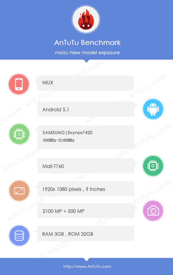 W bazie danych AnTuTu Benchmark pojawiło się nowe urządzenie od Meizu. Smartfon o nazwie kodowej Meizu NIUX zakończył test popularną aplikacją z wynikiem 69 tysięcy punktów. A to za sprawą układu Exynos 7420. Procesor wraz z 8-rdzeniowym chipem graficznym Mali-T760MP8 mają być wspierane przez 3-gigabajtową pamięć RAM. Obraz natomiast prezentowany będzie w rozdzielczości Full HD (1920 x 1080 pikseli).