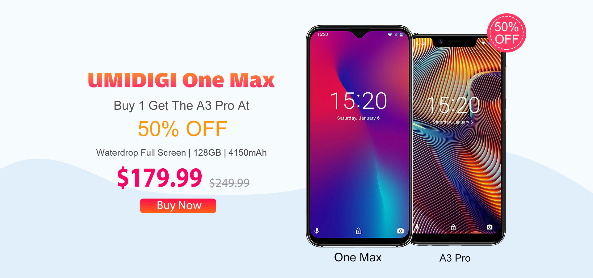Decydując się na zakup UMIDIGI One Max w sklepie internetowym banggood, zapłacicie za ten model 179,99 dolarów, a do tego uzyskacie rabat na zakup UMIDIGI A3 Pro za 50% ceny. Ta oferta jest godna uwagi, gdyż A3 Pro kosztuje wtedy 49.99 dolarów.