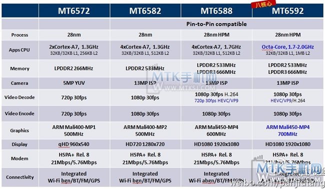Układ graficzny MALI-450MP4 będzie też w 4-rdzeniowym procesorze MediaTek MT6588, jednak jego taktowaniu to tylko 600 MHz. Poza tym będzie miał takie same możliwości jak nagrywanie filmów w FullHD, obsługa wyświetlaczy o rozdzielczości 1080p, 13-megapikselowe aparat czy też RAM o maksymalnym taktowaniu 666MHz.