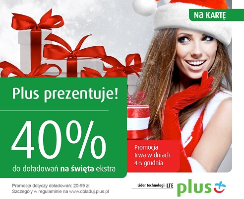 Aż 40% ekstra można otrzymać na Mikołajki po doładowaniu przez strony internetowe konta usługi „na kartę” w Plusie. Bonus tej wartości doładowania jest do wykorzystania na wszystkie dostępne usługi telekomunikacyjne: rozmowy, SMSy, MMSy, Internet. Specjalna promocja „Mikołajki” trwa w dniach 4-5 grudnia i dostępna jest dla klientów wszystkich usług na kartę w Plusie.