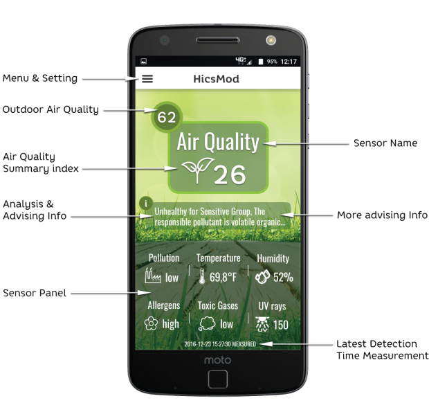 Podobnie działa także moduł HicsMod, który oprócz pomiarów temperatury, wilgotności, promieniowania UV, toksycznych gazów, alergenów i zanieczyszczeń powietrza umożliwia sterowanie kompatybilnymi urządzeniami smart home w domu lub biurze za pomocą podczerwieni (IR).