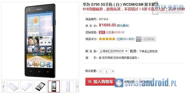 W związku z premierą nowego flagowca firmy Huawei – Ascend P6, obniżona została cena modelu Ascend G700, który w ubiegłym miesiącu świętował swój oficjalny debiut rynkowy w Chinach. Do tej pory smartfon można było kupić za 1999 juanów (około 1000 złotych), jednak od teraz oferowany jest za jedyne 1699 juanów (850 złotych).