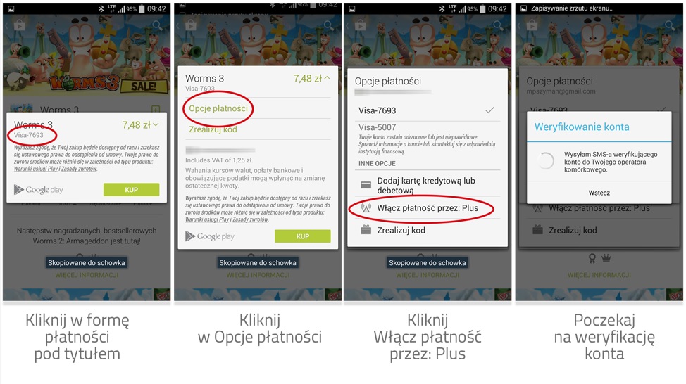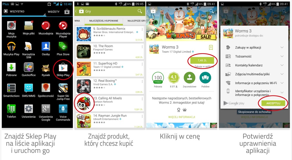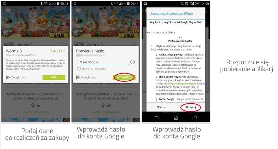 Aby dokonać zakupu w Google Play wystarczy tylko urządzenie z dowolnym systemem operacyjnym Android, aktywne konto Gmail i korzystanie z usługi abonamentowej w Plusie. Płatność przez dopisanie jej do rachunku w Plusie pojawi się automatycznie podczas najbliższej wizyty w Google Play i płacenia za zakupy. Po wybraniu opcję „Włącz płatność przez Plus” i akceptacji regulaminu usługi, płatność za dokonany zakup pojawi się na najbliższym rachunku telekomunikacyjnym jako pozycja w Dodatkowe Uznania i Obciążenia w części Rozliczenie Konta. Obok naliczonej kwoty widniała będzie nazwa zakupionej aplikacji oraz jej dostawca.