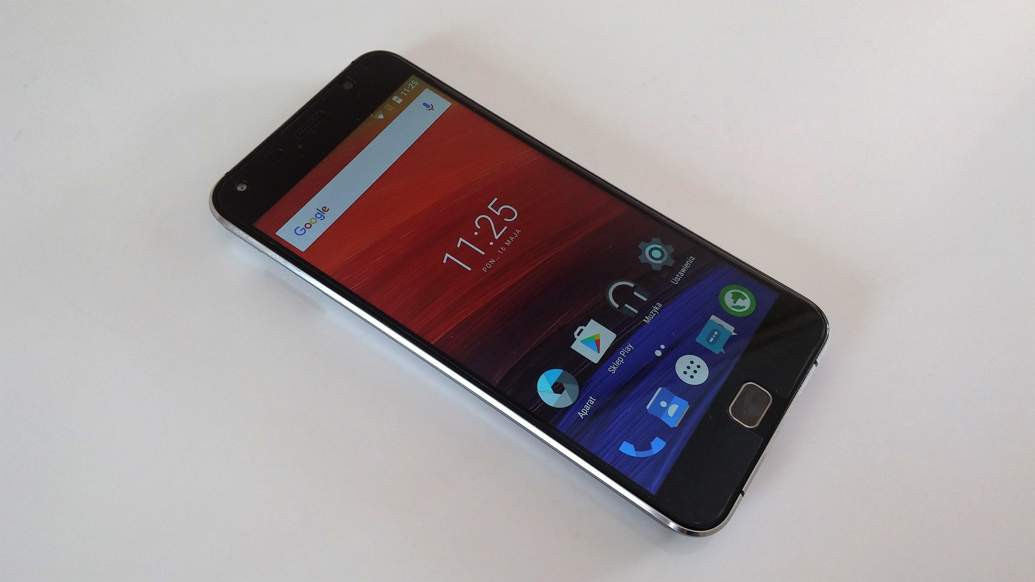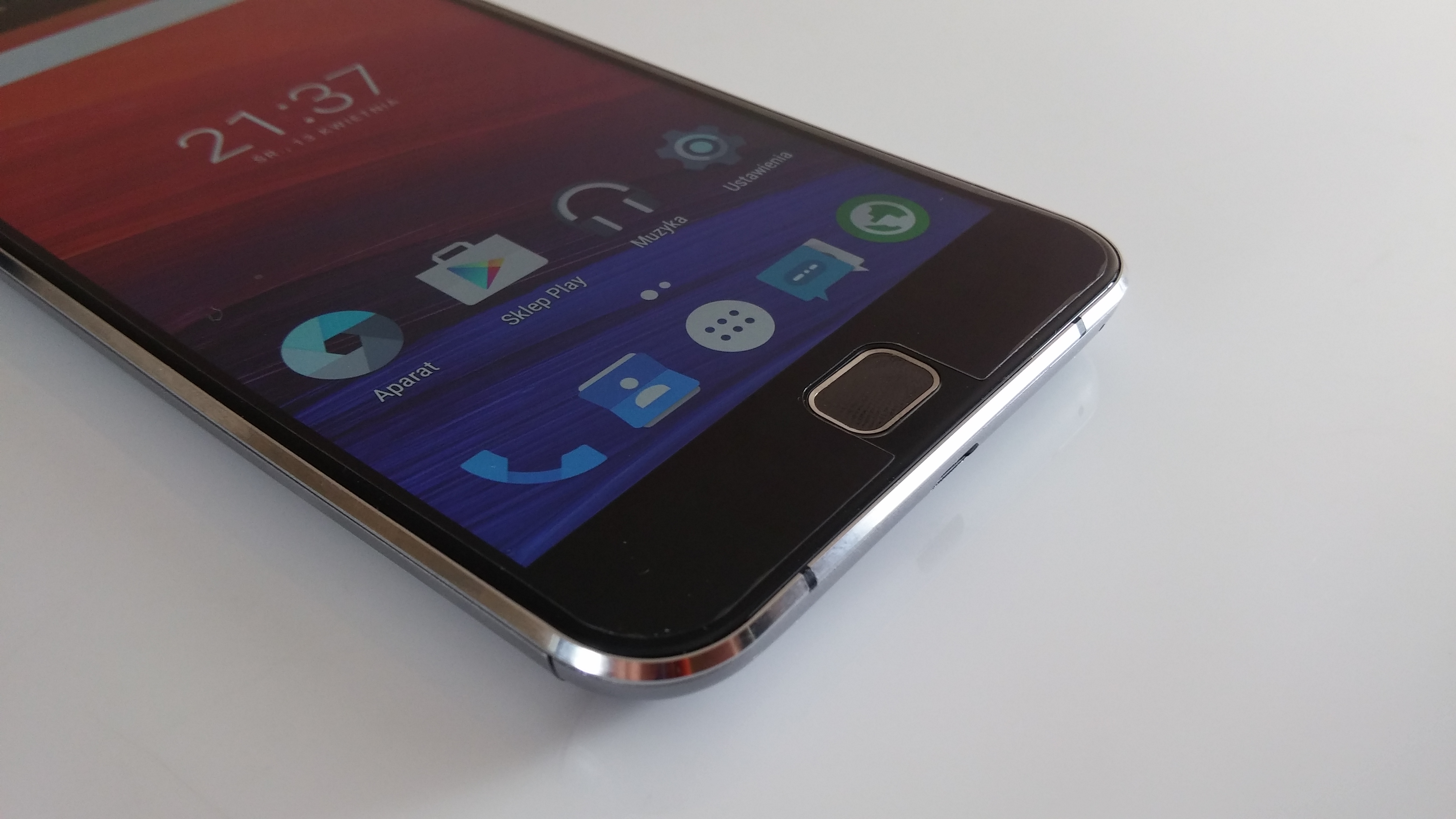 Frontowy panel to nie tylko 5,5-calowy wyświetlacz Full HD, dlatego też znalazło się tu miejsce dla dwóch przycisków pojemnościowych oraz fizycznego klawisza Home z wbudowanym czytnikiem linii papilarnych. Nad ekranem producent ulokował natomiast głośnik skryty pod minimalistyczną maskownicą, czujnik oświetlenia (działa prawidłowo), zbliżeniowy, dioda powiadomień oraz oczko kamery dedykowanej połączeniom z diodą doświetlającą.