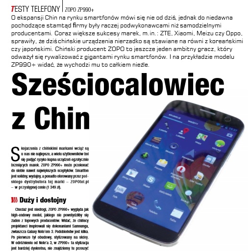 Duży, 6-calowy obszar roboczy, podzespoły zapewniające wydajną pracę systemu Google Android 4.2 Jelly Bean (aktualizacja do wersji 4.4 KitKat), akumulator umożliwiający długi czas pracy na pojedynczym ładowaniu, a także podwójny slot kart SIM sprawiają, że ZOPO ZP990+, to urządzenie typowo biznesowe. Jeśli jesteście ciekawi, jak owy model sprawuje się w codziennym użytkowaniu, zapraszamy do zakupu majowego numeru magazynu MOBILITY, którym znajdziecie pierwszą, “papierową” recenzję ZOPO ZP990+.