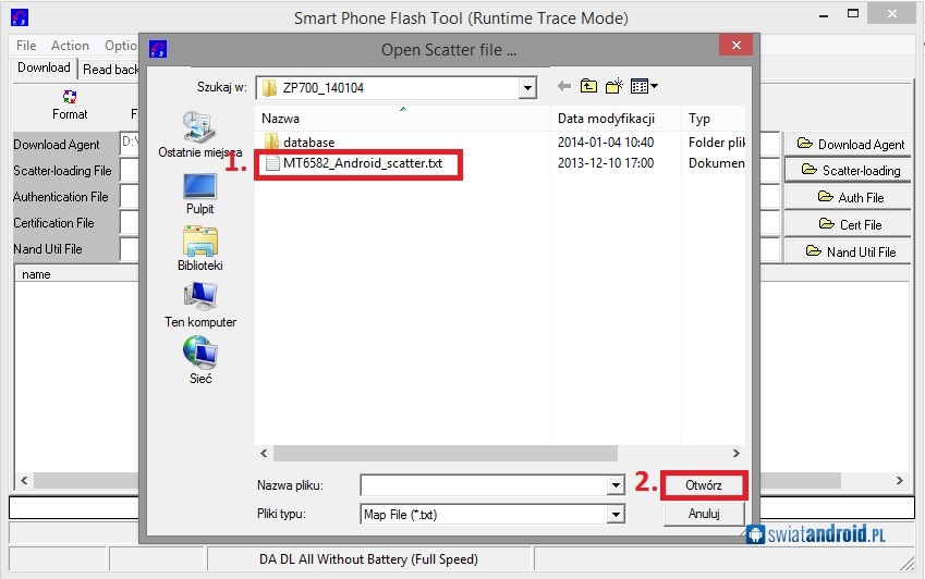 • Wybieramy opcję Scatter Loader i zaznaczamy plik MT6582_Android_scatter.txt