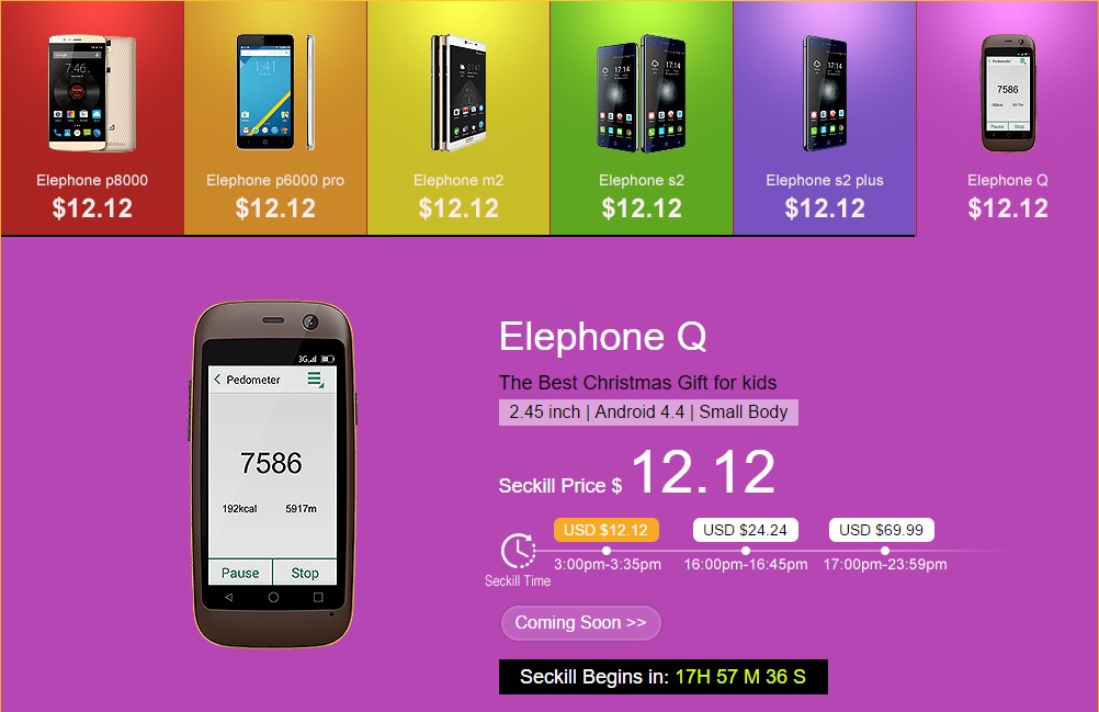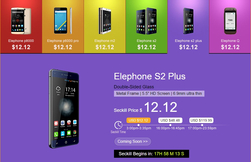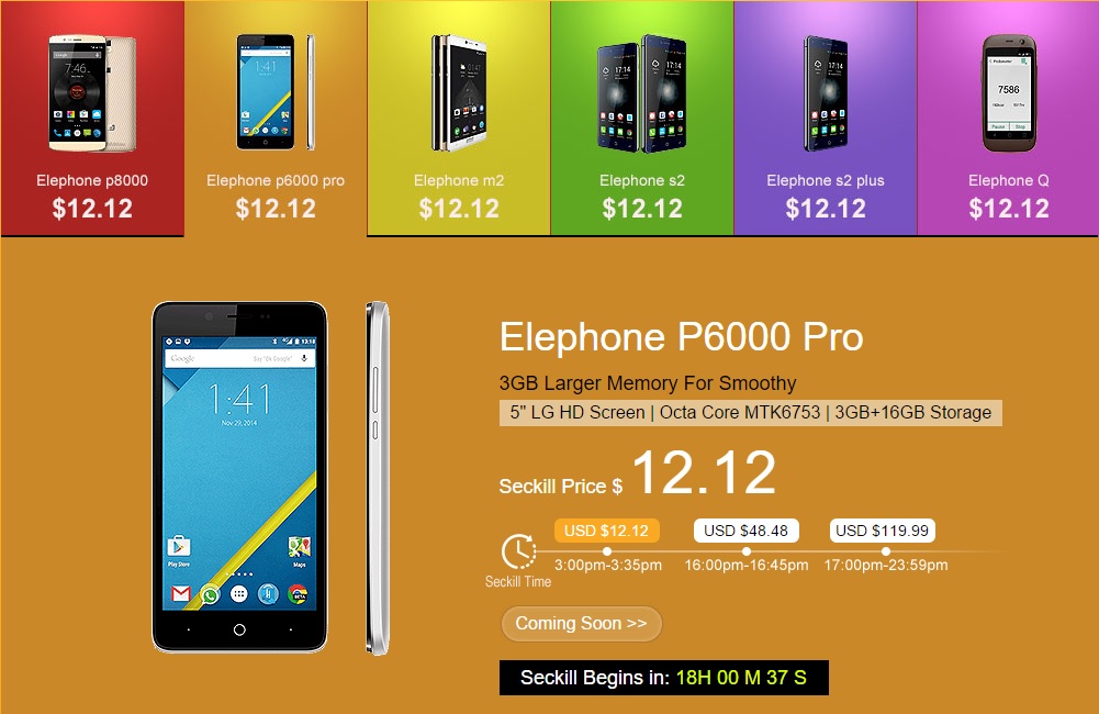 Już jutro (12/12/2015) od godziny 8:00 polskiego czasu wybrane smartfony firmy Elephone będzie można zakupić znacznie taniej. A to dzięki akcji Flash Sale, zorganizowanej przez producenta. Do wyboru mamy sześć modeli: Elephone P8000, Elephone P6000 Pro, Elephone M2, Elephone S2, Elephone S2 Plus oraz Elephone Q. Jeśli się Wam nie uda, pozostaje jeszcze promocja w dniach 16 – 18 grudnia. W każdym przypadku ilość sztuk jest ograniczona. Poniższe ceny nie zawierają kosztów przesyłki towaru.