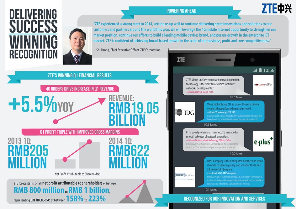 Trzykrotny wzrost dochodu w pierwszym kwartale 2014 roku był możliwy dzięki dynamicznemu rozwojowi firmy na rynku technologii 4G/LTE. Zysk netto w pierwszym kwartale bieżącego roku wyniósł 622 miliony RMB, co oznacza wzrost o 203,5% w stosunku do roku poprzedniego. Podstawowy zysk na akcję odpowiada górnej granicy wcześniejszej prognozy i kształtuje się na poziomie 0,18 RMB. Przychody wzrosły o 5,5% do 19,05 miliarda RMB.