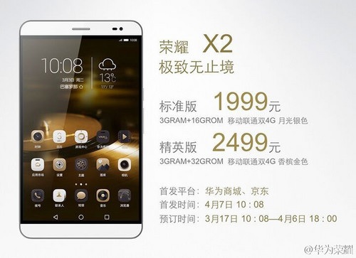 W niemieckim Amazonie rozpoczęła się przedsprzedaż Huawei MediaPad X2 Standard Edition. Tablet oferowany jest w dwóch wariantach. Edycja standardowa z 2 GB pamięci RAM oraz 16 GB pamięci wewnętrznej wyceniona została na 349 euro, natomiast dla bardziej wymagających klientów przygotowana została wersja Premium z 3 GB pamięci RAM oraz 32 GB pamięci wewnętrznej, którą wyceniono na 399 euro.