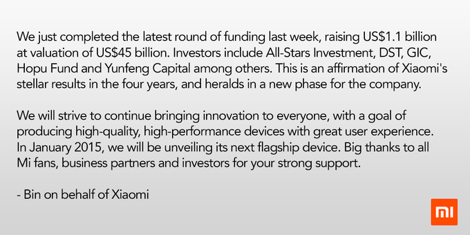Lei Jun jako prezes firmy ma największe kompetencje w przekazywaniu tak dobrych wieści. Na 15 stycznia zaplanowane zostało spotkanie, podczas którego światu zaprezentowane zostanie nowe urządzenie. Lei Jun nie określa dokładnie, co zostanie pokazane. Od zawsze Xiaomi największy potencjał miał w produkcji i sprzedaży telefonów komórkowych na autorskiej modyfikacji Androida – MIUI, którego coraz nowsze odsłony zyskują popularność na całym świecie ze względu na ilość dostępnych portów, lekkość i łatwość obsługi. Równie dobrze może być to dowolny sprzęt, również niezwiązany bezpośrednio z Androidem. W końcu od premiery Xiaomi Mi4, który jest w tym momencie flagowym modelem tego producenta, minęło ledwo 6 miesięcy.