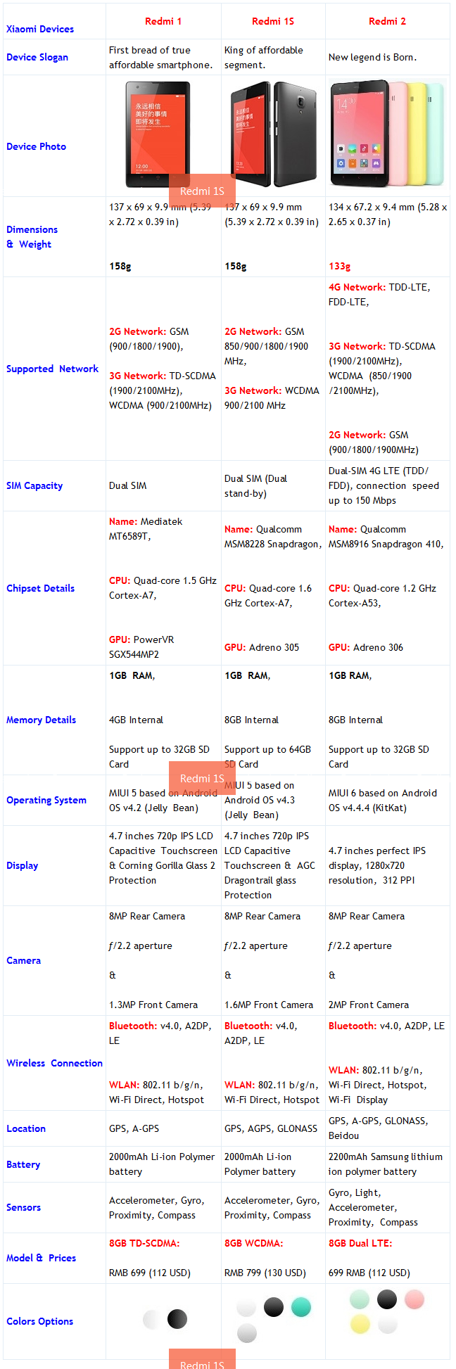 Porównanie Redmi 1 vs Redmi 1S vs Redmi 2