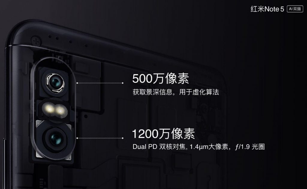 Najważniejszą zmianą względem Xiaomi Redmi Note 5 Pro, a zarazem nowością w Redmi Note 5 (AI Dual Camera) jest udoskonalony moduł aparatu głównego. Na wyposażeniu, co prawda nadal jest aparat główny 12MP, współpracujący z obiektywem pomocniczym z pięcioma milionami pikseli. Zmieniła się jednak przysłona obiektywu, która ma teraz wartość F/1.9, zamiast F/2.2. Ponadto został powiększony pojedynczy piksel, który ma teraz rozmiar 1,4μm. Te modyfikacje sprawią, że możliwe będzie wykonanie fotografii o lepszej jakości w gorszych warunkach oświetleniowych, gdyż powinny charakteryzować się lepszą jasnością, a także wyższą szczegółowością, względem tego, co oferuje Redmi Note 5 Pro. Charakterystyka aparatu obejmuje także Dual PD, a zatem szybszy pomiar ostrości. Aparaty wspierane są przez dwie dwutonowe dody doświetlające LED.