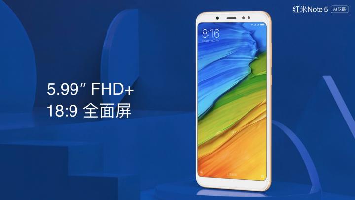 Xiaomi Redmi Note 5 (AI Dual Camera) posiada wyświetlacz o proporcjach 18:9 i przekątnej 5.99”, który charakteryzuje się jasnością 450 cd/m², a także rozdzielczością Full HD+ (2160 x 1080 pikseli). Ekran zastosowany w phablecie cechuje się zagęszczeniem pikseli na cal wynoszącym 403. Ekran pokryty został taflą zakrzywionego szkła 2.5D – jest to Corning Gorilla Glass trzeciej generacji. W oprogramowaniu obecny jest między innymi filtr światła niebieskiego, a także możliwość dostosowania temperatury barwowej, poprzez zmianę kontrastu.