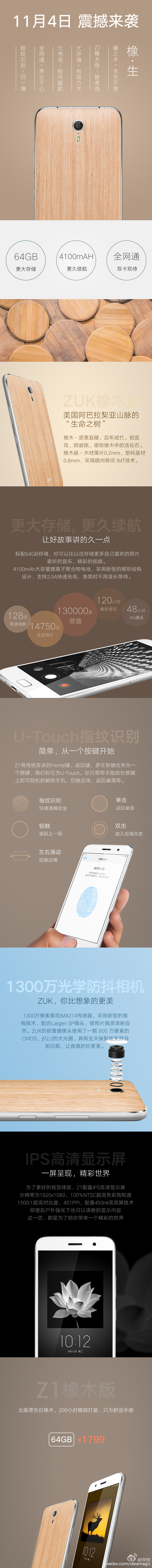 Od dzisiaj w Chinach można zakupić ZUK Z1 w nowej, limitowanej odsłonie. Smartfon z wykończeniem z drewna dębowego oferowany jest za 1799 juanów. Niestety na chwilę obecną nie wiemy, czy międzynarodowy ZUK Z1 również zadebiutuje w drewnianej wersji.